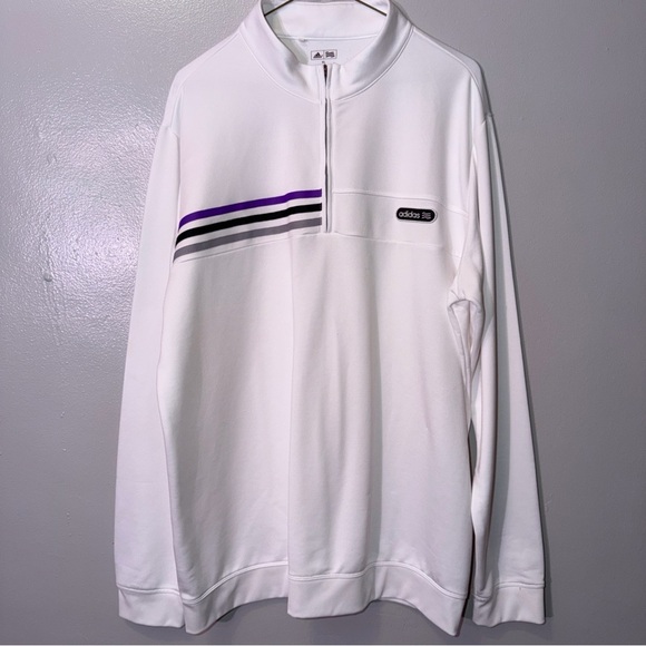 Classic zip-up design. White base with bold purple stripes. Perfect for casual wear.
