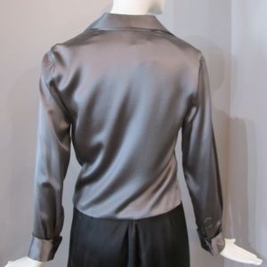 Draped knot-front grey silk charmeuse blouse with collar and French cuffs (no cufflinks). Invisible side zipper on left side. Fully Lined. Size 6. Brand new.