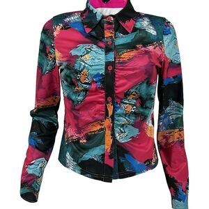 Vibrant ruched button front top with abstract patterns. Features a mix of bold colors. Perfect for a statement look. Brand new. Size XL