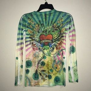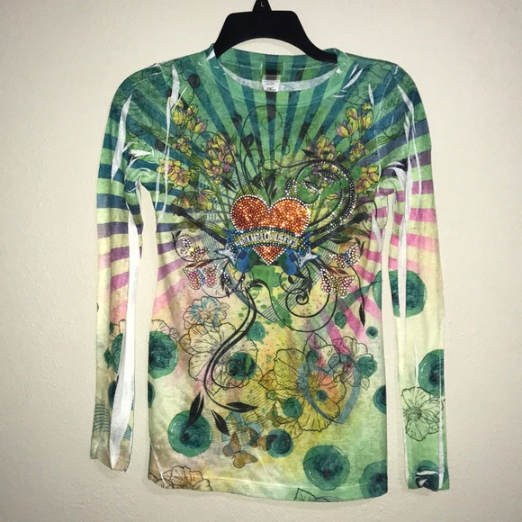 This long sleeve tee has rhinestones in the front. Guitar & music design. In great condition! Purchased at a boutique. 100% polyester.