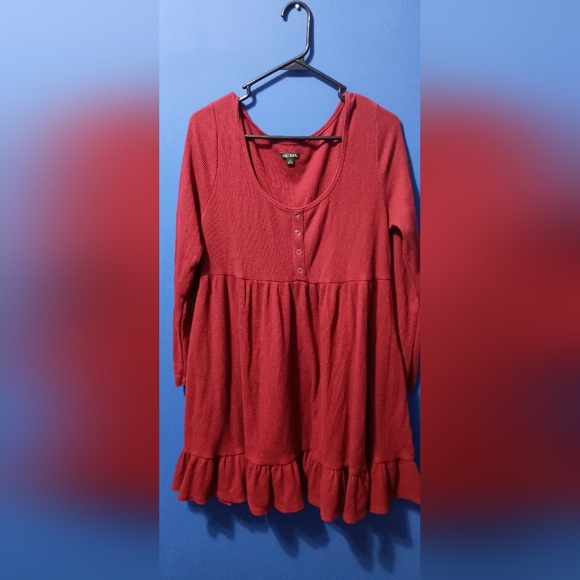 Gently used long sleeve Ruffle dress in a pretty burgundy shade. Worn only once or twice. The length reaches slight above the knee. Super cute paired with a pair of knee high boots and jean jacket!