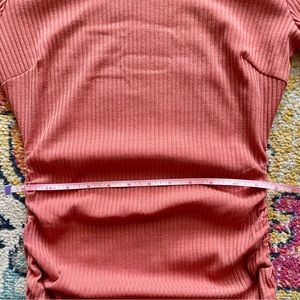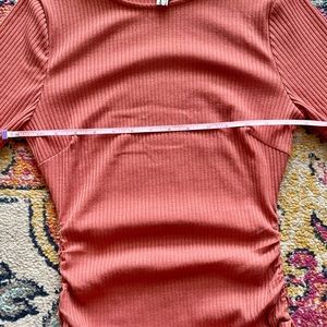 * Design: Bodycon, bandage, rib-knit, round neck, ruffle trim, ruched detailing.