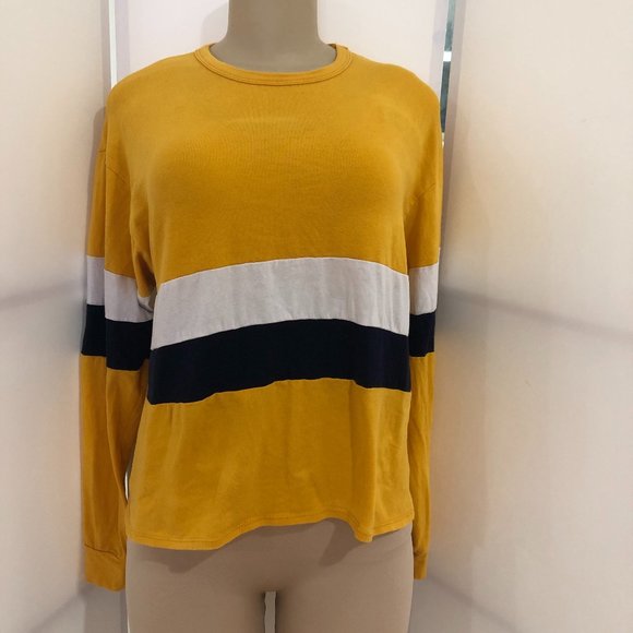 Long Sleeve top with sporty rugby stripes. Gold, Navy and White. Cal Berkeley Colors, roll on you Bears!