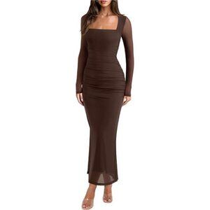 Long Sleeve Sheer Mesh Square Neck Long Dress Brown