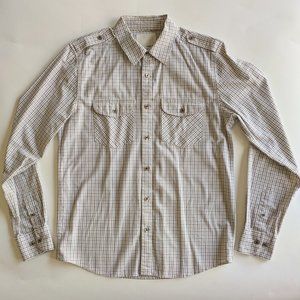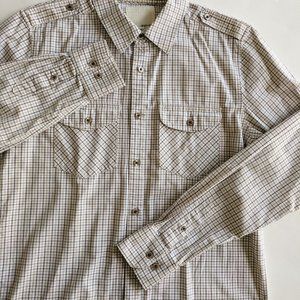 Forever 21 casual long sleeve buttondown shirt with shoulder tabs. Micro check plaid in off white, brown, & tan. Two chest flap pockets. Urban casual style. Slim fit. 100% cotton. EUC