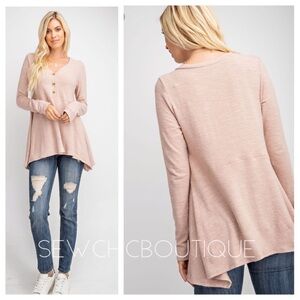 Washed Cotton Blend Slub Knit Long Sleeve Top with Shark Bite Hem & Button Detail. This top is a tunic bc of the length. It’s fitted up top like a babydoll top just below the bust, where it then flares out with an uneven shark bite bottom hemline. The color is called desert sand. It’s a mix between a cream, tan and blush.