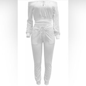 Long Sleeve Two Pieces Outfits Tracksuit Lace Up Off Shoulder Casual Sweatsuit