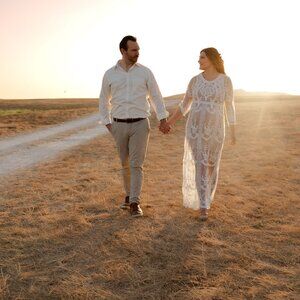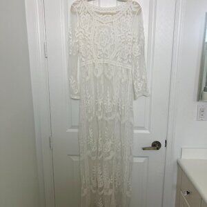 Long Sleeve White Lace Floral Maternity Maxi Photoshoot Dress w/ Tan Slip Dress
