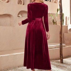 Long Sleeve Wrap V-neck Belted Velvet Burgundy Maxi Dress