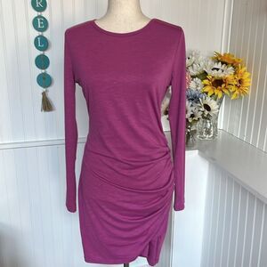 Fuchsia pink Long sleeve scoop neck dress ruched side the t hem, fully lined