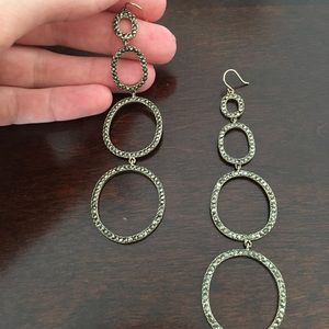 Long, circular, dangle earrings. Sparkly rhinestones with gold-tone frame.