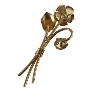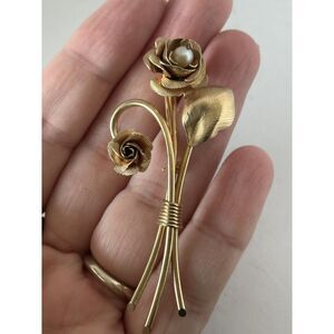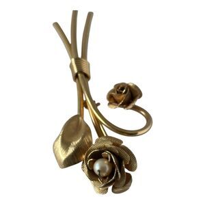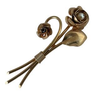 Long Stem Rose and Cultured Pearl Brooch Textured Gold Tone