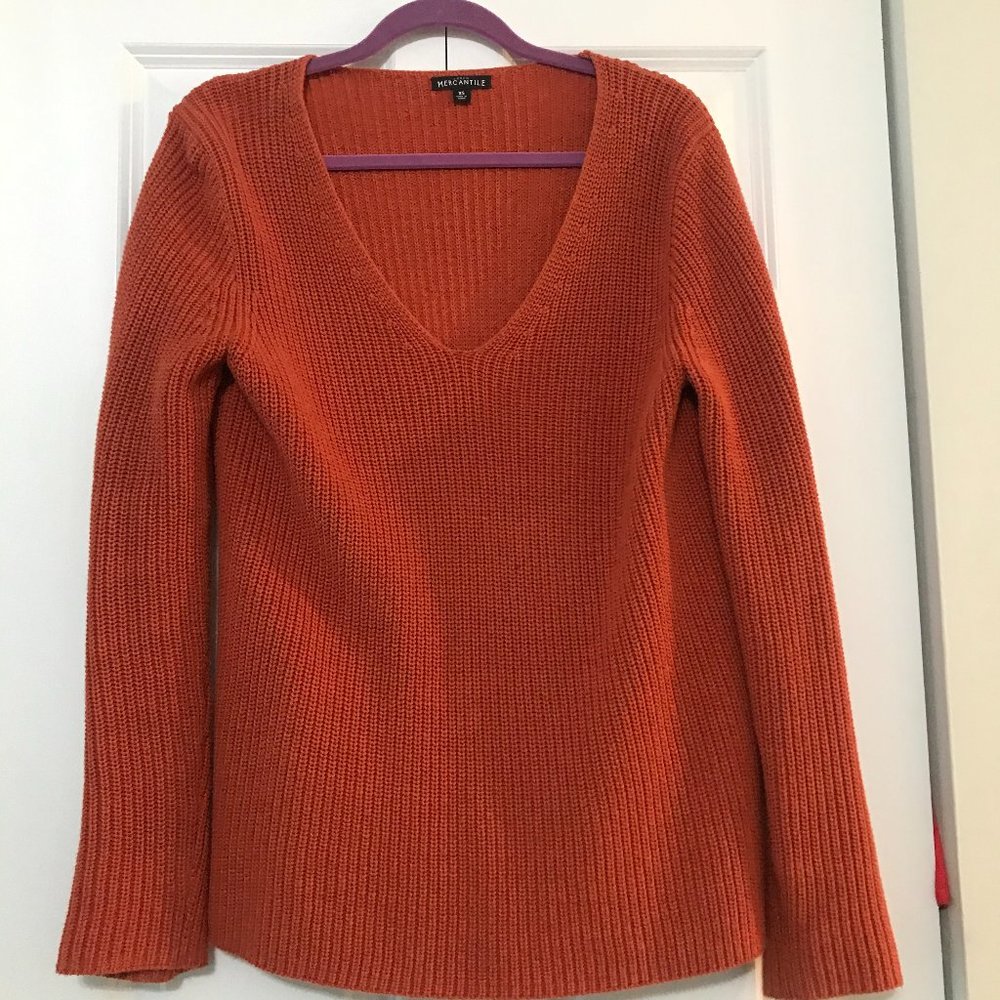 Burnt Orange Sweater from J. Crew (their MERCANTILE line). Super comfortable and worn /washed a few times. Size is XS but it has a boxy fit - looks great with leggings.
