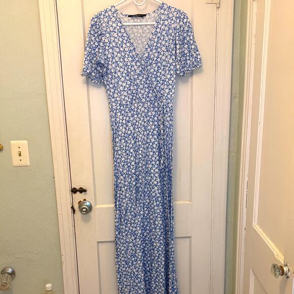 Charming blue maxi dress with white floral design. Short sleeves and V-neckline. Ideal for casual outings. U.K size 12-U.S. size 8.