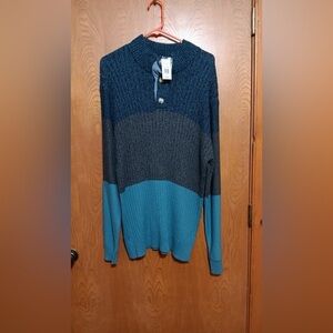 Long Tunic Length Sweater Blue,Charcoal Gray and Turquoise Large