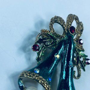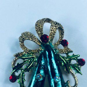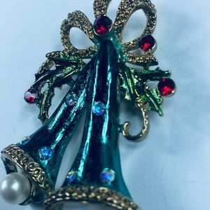 Long Two Bell Christmas Holiday Brooch Pin Holly Faux Pearls Rhinestone Bows.