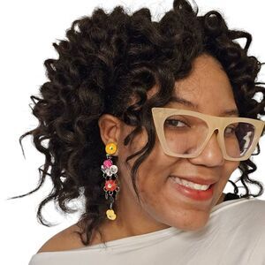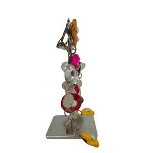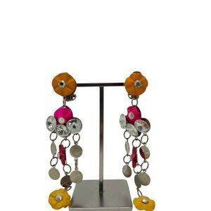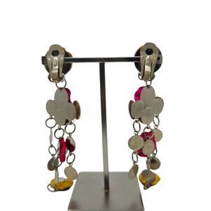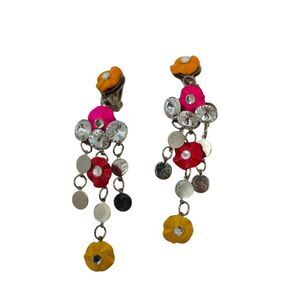 These bold and rare vintage clip-on earrings feature colorful pink, red, and yellow wooden flowers arranged in a lightweight chandelier style. Measuring 4" in length, these statement earrings are perfect for adding a daring and extravagant touch to your look. Their unique combination of floral and rhinestone details, along with metal spirals, makes them an ideal accessory for anyone who loves vintage boho style with a bold, runway-inspired edge.