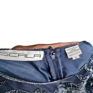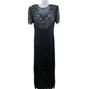 This elegant vintage Scala dress exudes sophistication, with intricate beadwork and sequins that create a stunning visual effect. The dress features a captivating design at the neckline, embellished with silver beads and sequins in a floral or abstract motif, adding a touch of glamour. The bodice and sleeves continue the beaded detailing, with short sleeves and a sheer overlay near the collar that enhances the dress’s sophisticated allure. The full-length gown is finished with a scalloped or jagged edge at the hem, giving it a timeless vintage appeal. Perfect for formal occasions, this piece embodies the opulence and quality of vintage fashion.