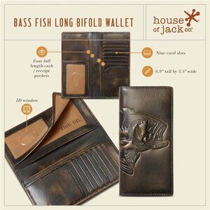 🧿Gone Fishin' ... Jack's Bass Fish Long Bifold delivers a slim profile and an organized interior with four full-length bill compartments and multiple card slots. Designed with quality craftsmanship and burnished by hand, the Bass Fish Tall Wallet will develop a rich patina with time and use. Check out the "fish on" screen print in the cash pocket.
