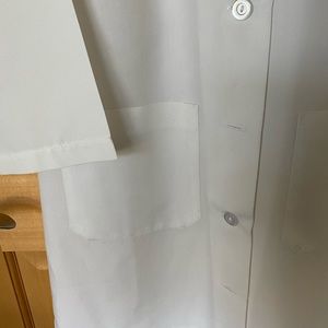 Long white button down clinical lab coat, size 30 (S). Two deep front pockets and left breast pocket. Length 28” from armpit. 80% polyester / 20% cotton for easy washing. In excellent condition with no stains or marks. Name tag has been removed from back inside collar.