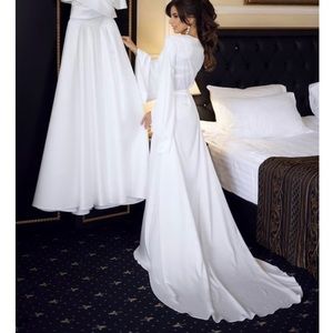 Luxury long bridal robe with a wide amazing long train. Delicate gown for a perfect brides morning Material flows like a waterfall, very pleasing to the body. It definitely is a must see to appreciate its true beauty.