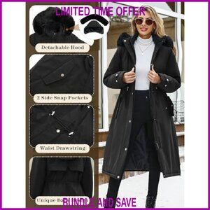 Long Winter Puffer Coat with Detachable Hood, Maxi Length, Windproof