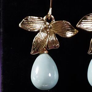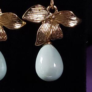 Long Wire Earrings w/ Gold Tone Bows & Pearlescent Mint Green Egg Shaped Dangles. These are gorgeous long wire earrings in gold tone metal with a gold bow at the bottom of the wire and a mint green shiny pearlescent egg dangling underneath. They drop about 3 inches. These are pre-owned and may have minor wear, but still look to be in good condition.