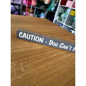 Long short wooden block sign that says caution, dog can't hold it's licker!! in white on the front.