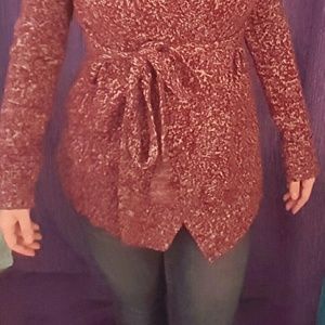 Red and cream wrap sweater is perfect for fall days. It is 100% acrylic and very warm. This sweater has a hood.