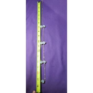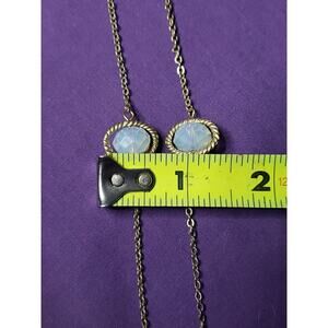 This is a beautiful long gold tone metal chain necklace with seven opalescent frosted faceted glass bead stations surrounded by a textured gold tone oval frame. It drops about 17 inches and is about 34 inches long with an additional 2.5-inch extender. This is a pre-owned item and it may have minor wear but still looks to be in very good condition.