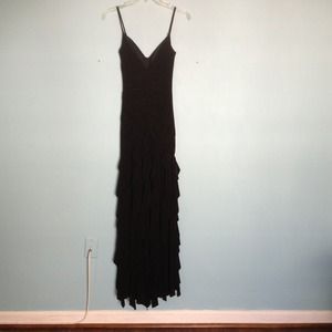 Beautiful long black V-Neck, spaghetti strap formal dress with fitted top portion and long flowing bottom. This dress announces true elegance for anyone. The top is decorated with beautiful diamond colored gems. This dress has been worn for about 4 hours and is in perfect condition. This is Scott McClintock brand Name dress from Macy's. It is a size 4. It is made in the USA.