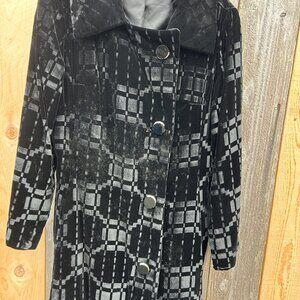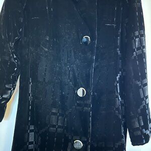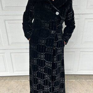 This gorgeous vintage 55" long black, acetate lined evening coat has a 38" bust , shoulders: 36" sleeves: 24" long.. It's in mint condition. The cut velvet is an asymmetrical design. There are 2 side pockets and it has its original slate black buttons