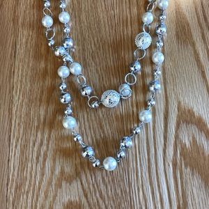 Chunky silver tone layered strand necklace. The necklace is long, and is a pullover style. The bottom of the necklace has two strands, one longer than the other. The bottom strands have pearls, and silver and gray beads scattered throughout for a chic and stylish look. The necklace measures 20 inches from top to bottom. A unique piece that can be dressed up or down. In great condition!