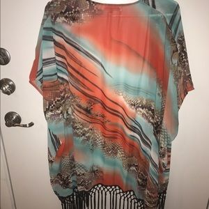 Basically almost new without tags beautiful cover up/cardigan to go over clothes or a bathing suit. Size is medium. It was purchased at a boutique. Let me know if you have any questions. No trades sorry.