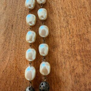 Fake pearls, fake rainbow crystal, brass-toned carved metal spheres with chain links in between