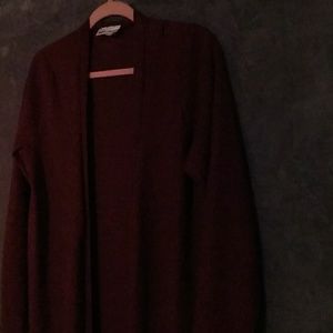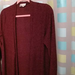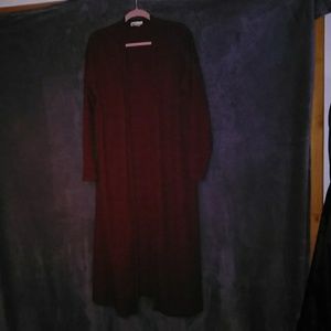 This duster hits 4-6 inches above the ankle. It's a ribbed material and is a maroon and black color. This duster is really comfortable and great to throw on over a cami and skinny jeans w boots! This was a gift and is to small.Never been worn. This is marked 3X but fits like a 1X