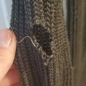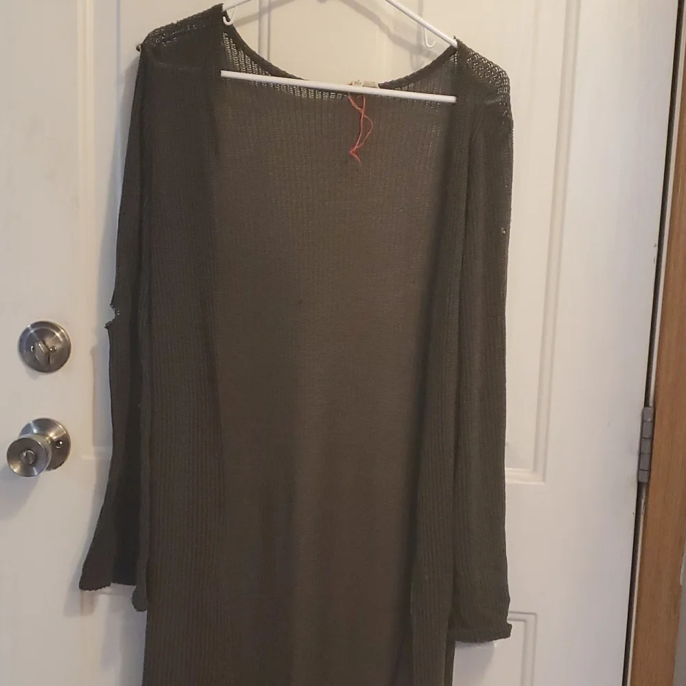 this is an olive green duster that's in good condition other then a small hole in the right sleeve.