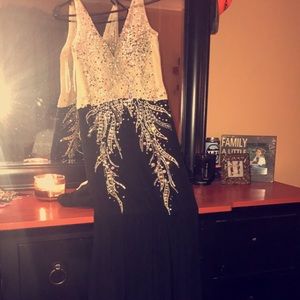 Black and gold with silver embellishments, so beautiful and very classy, for prom or any formal occasion. Size 10, can definitely fit a 6-10!