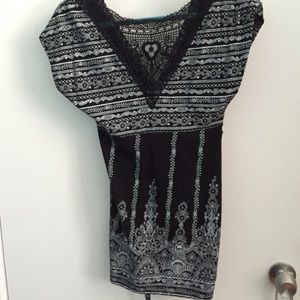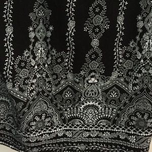 Black and white long floral shirt. V neck. Lack detailing on back. Bow tie on back