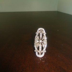 Very unique ring looks good on the finger. It's in a fair condition: some small crystals are missing and there is a sign of wear and tarnish.