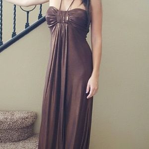 Long Bronze formal dress. Size S/M, no tags. It has a built in bra and hidden zipper in the back. Great dress for prom or formal! Only wore once, loved it.