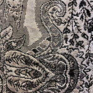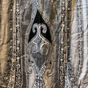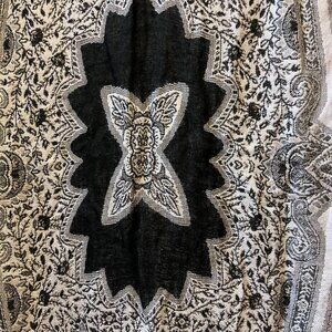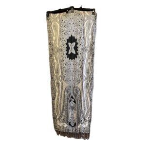 Long grey, black, and white knit scarf with tassels. Mint condition. Beautiful scarf made of lightweight, soft, and warm rayon. Would make a fantastic gift.