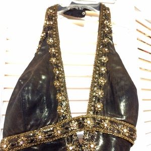 Very pretty, only worn once prom dress. It's like a bronze color, lined with rhinestones. Is an XL, exact measurements per request. Reasonable OBO.