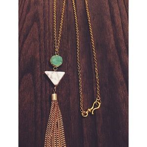 This piece features a Howlite Triangle Bead (marble-like) and Turquoise Druzy Pendant. Each necklace hangs approximately 16 inches. The druzy pendant, triangle bead, and tassel together measure 5 inches... Please be aware that this necklace is handmade, therefore the piece you receive may have subtle differences than the one in the pictures... Happy shopping! ;)