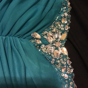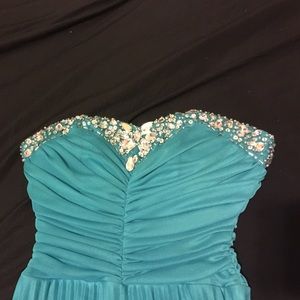 Beautiful sweetheart teal dress with jewel embezzlement on top. Only worn once . Middle jewel broken but easily fixed. Otherwise in great condition