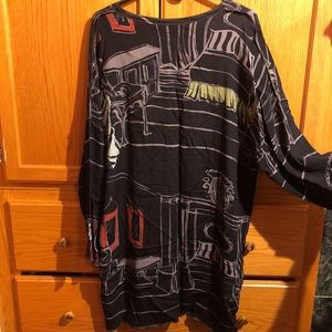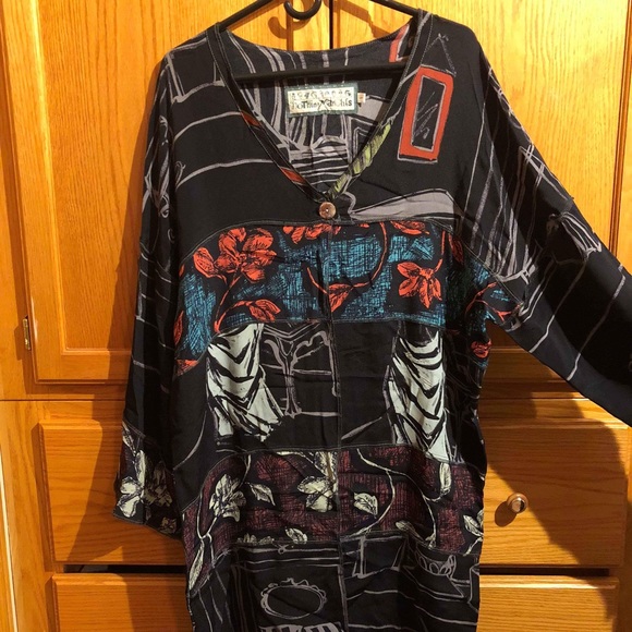 Black lightweight duster jacket with multicolor print. One button closure in front. Excellent condition and very unique.