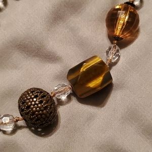 Golds, browns, crystal, wood, all make this necklace one that goes with so many outfits!