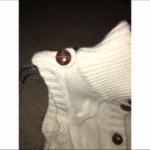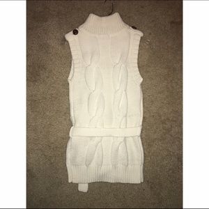 Keep warm with this Super cute knitted, white belted sweater button-up vest. Pair with a long sleeve tee or turtle neck underneath.