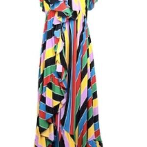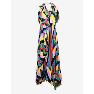 Colorful striped silk halter dress detailed with flounced trims, elasticated waist and asymmetric hem. For Resort, Serafini’s colors are vibrant, his shapes are ruffled and fluid, and his dresses are fringed with silk tassels. Watch them shimmy on the dance floor. ruffle-trimmed, rainbow-stripe poplin dress. For Resort, Serafini’s colors are vibrant, his shapes are ruffled and fluid, and his dresses are fringed with silk tassels. Watch them shimmy on the dance floor.