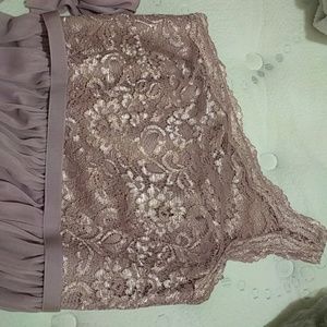 Worn once to a wedding. Gorgeous blush rose gold long dress with metallic lace illusion one shoulder. Boned lace bodice with grosgrain ribbon belt at waist. Long mesh skirt with a slit. Super comfortable and easy to move in. Fully lined. Back zip.